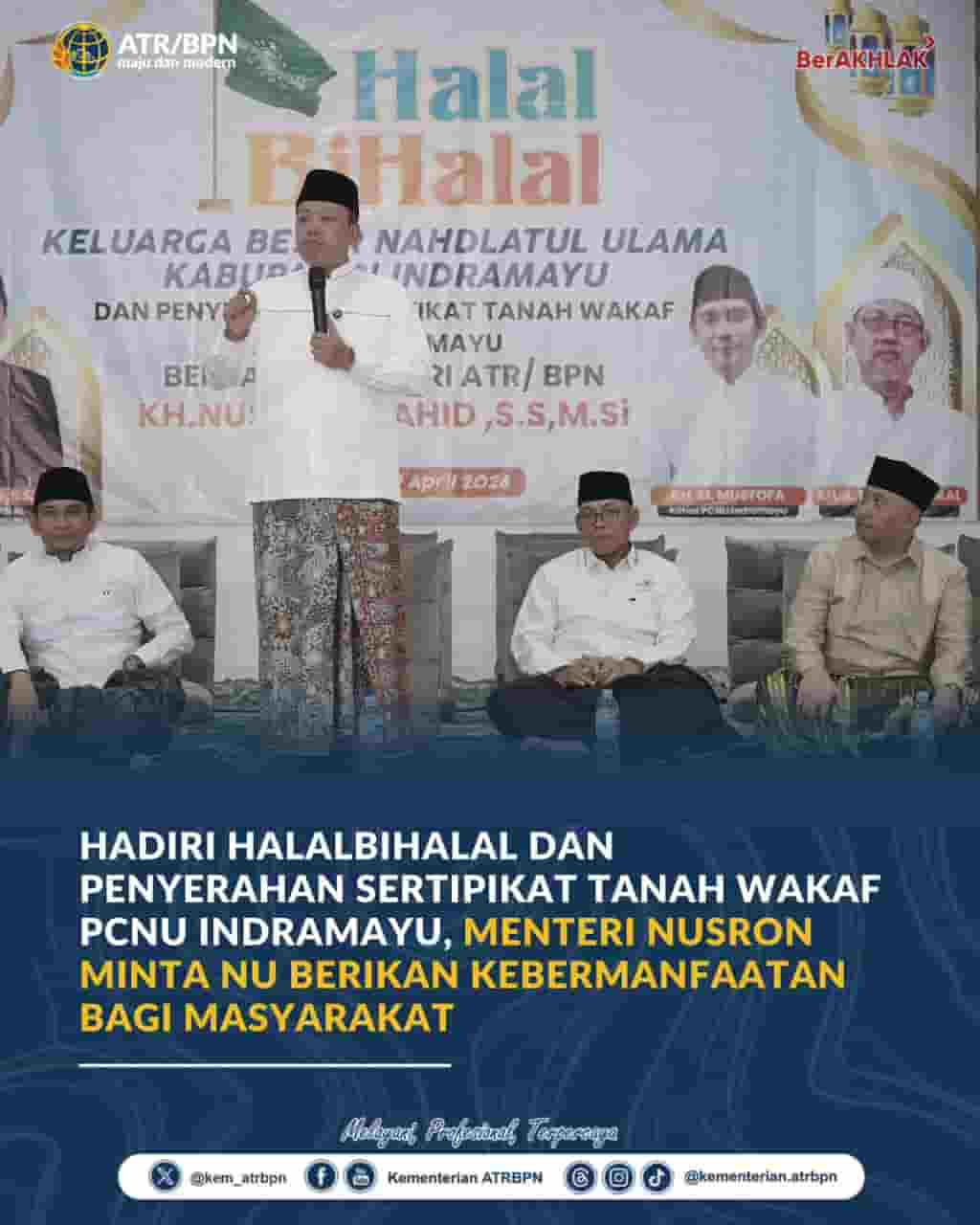 Indramayu,TOPINFORMASI.COM  – Menteri Agraria dan Tata Ruang/Kepala Badan Pertanahan Nasional (ATR/BPN), Nusron Wahid, mengajak Nahdlatul Ulama (NU) untuk terus berperan dalam memberikan manfaat nyata bagi masyarakat. Hal tersebut disampaikannya saat menghadiri kegiatan Halalbihalal dan Penyerahan Sertipikat Tanah Wakaf Pengurus Cabang Nahdlatul Ulama (PCNU) di Kabupaten Indramayu, Minggu (19/04/2026).