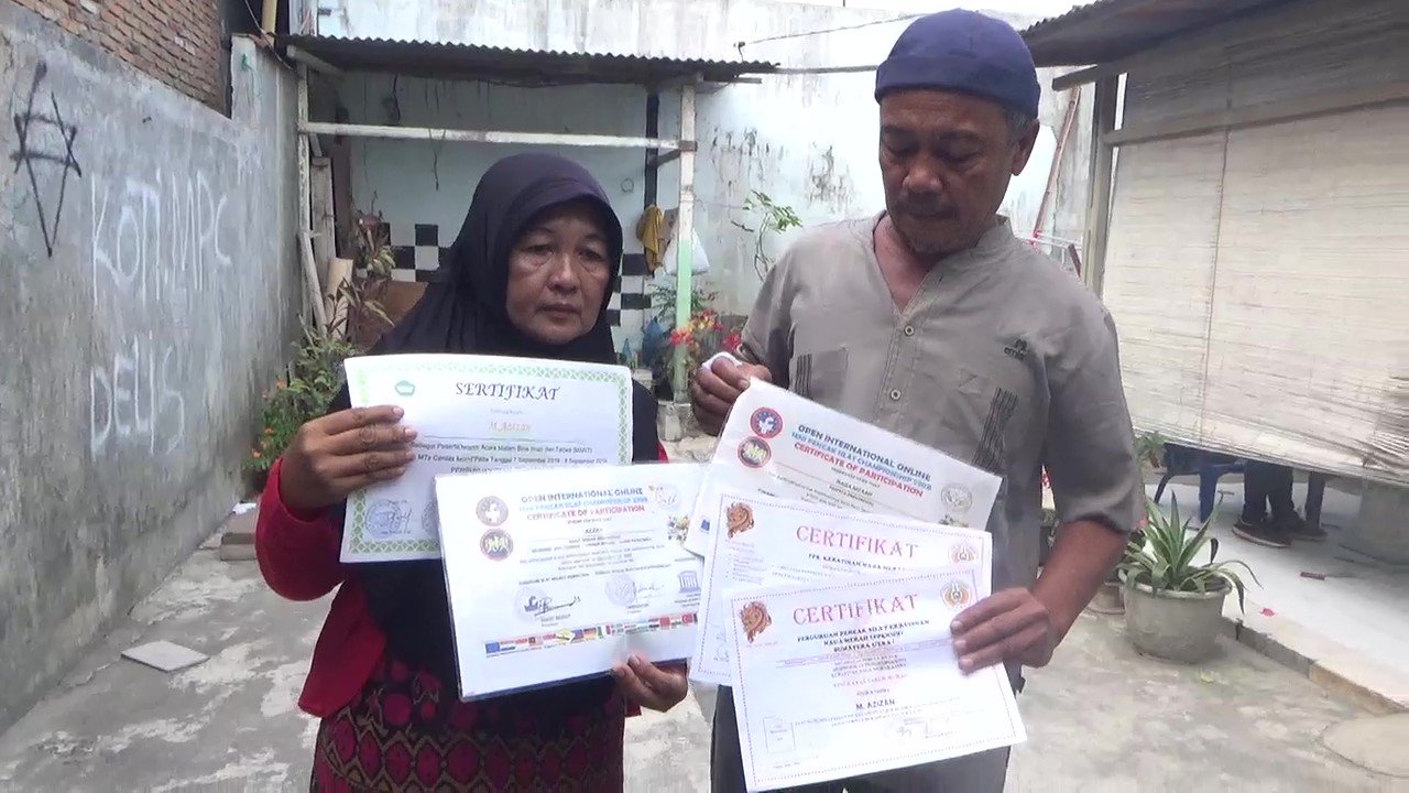 Ibu M. Azizan dan suaminya menunjukan beberapa sertifikat-sertifikat prestasi Azizan di Seni Pencak Silat Indonesia usai membuat laporan dugaan salah tangkap dan penembakan di Kantor Bidpropam Polda Sumatera Utara, MEDAN, Sabtu pagi 14 Februari 2026. (topinformasi.com/ /Foto: Aris Sinurat).