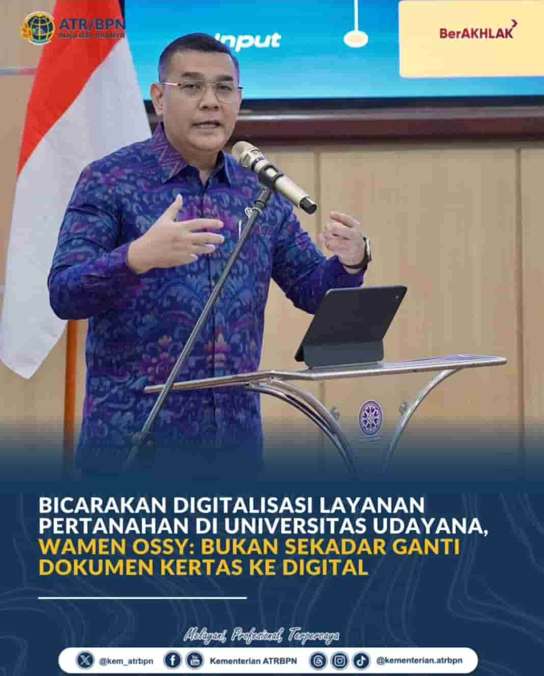 TOPINFORMASI. Bali — Wakil Menteri Agraria dan Tata Ruang/Wakil Kepala Badan Pertanahan Nasional (Wamen ATR/Waka BPN) Ossy Dermawan menegaskan bahwa digitalisasi layanan pertanahan bukan sekadar mengubah dokumen fisik menjadi digital, melainkan bagian dari transformasi menyeluruh dalam sistem pelayanan pertanahan.