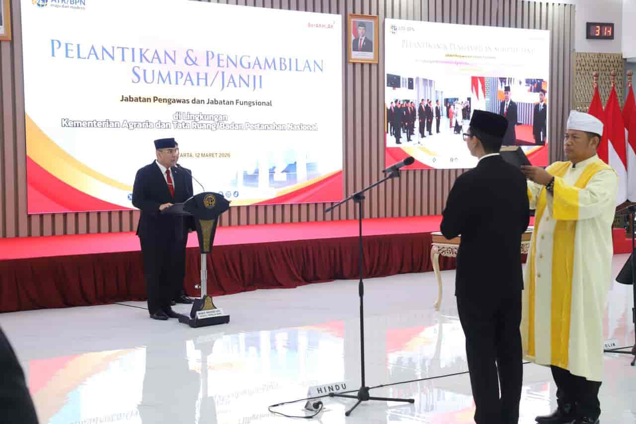 JAKARTA,Topinformasi – Kementerian Agraria dan Tata Ruang/Badan Pertanahan Nasional (ATR/BPN) menggelar pelantikan dan pengambilan sumpah/janji Jabatan Pengawas dan Jabatan Fungsional di Aula Prona Kementerian ATR/BPN, Jakarta, Kamis (12/3/2026).